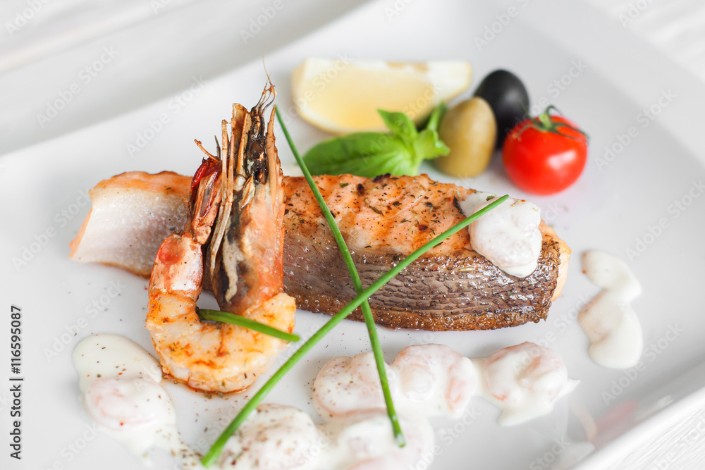Grilled Salmon And Shrimp With Cream Sauce On White Plate Traditional Mediterranean Prepared Seafood Stock Photo Adobe Stock